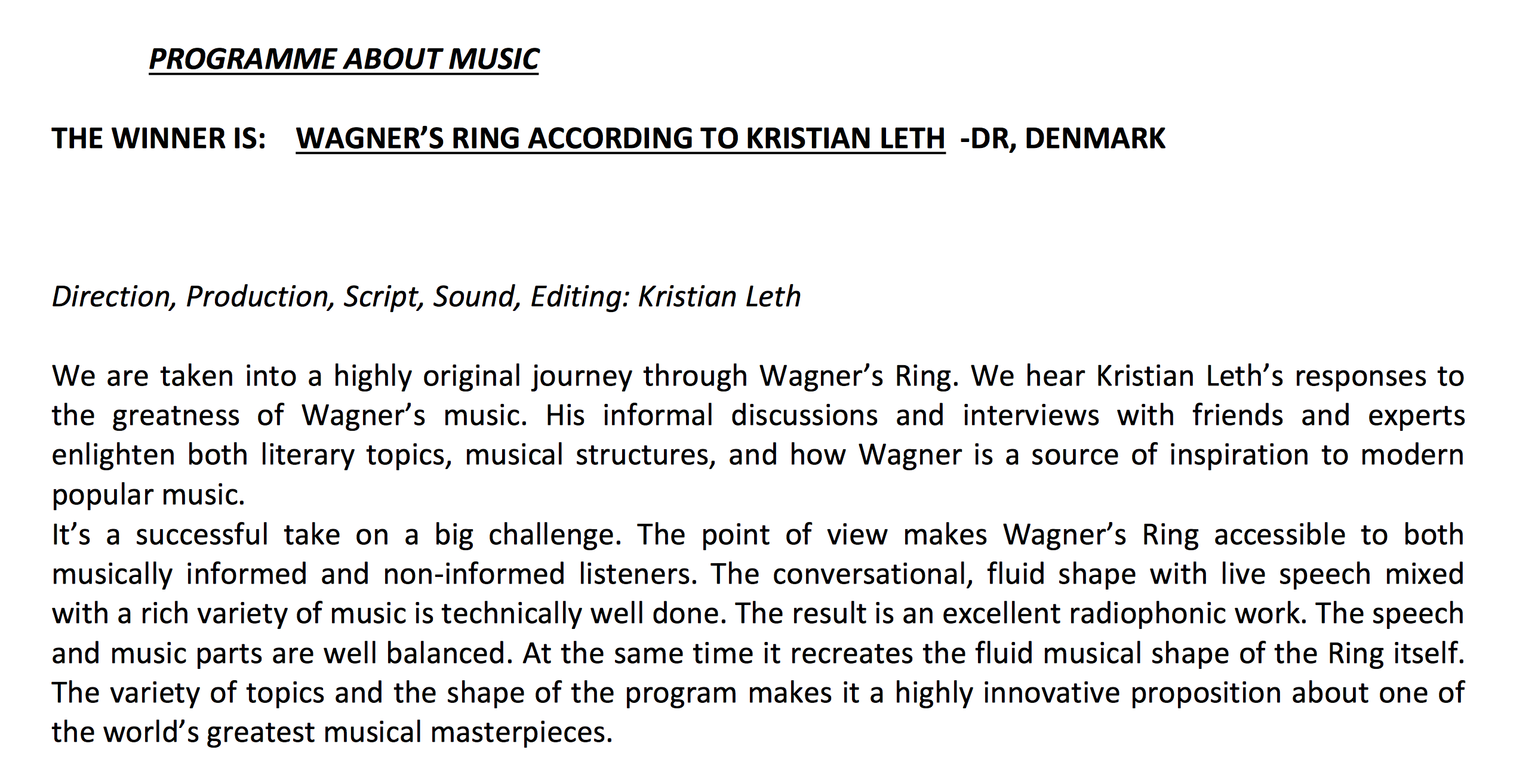Winner Prix Italia 2014 .October 15, 2014January 22, 2015Uncategorized Post navigation Next Kristian won the “Prix Italia 2014” for ‘Wagner’s Ring According to Kristian Leth’. Share this: Click to share on X (Opens in new window) X Click to share on Facebook (Opens in new window) Facebook Like Loading... Related